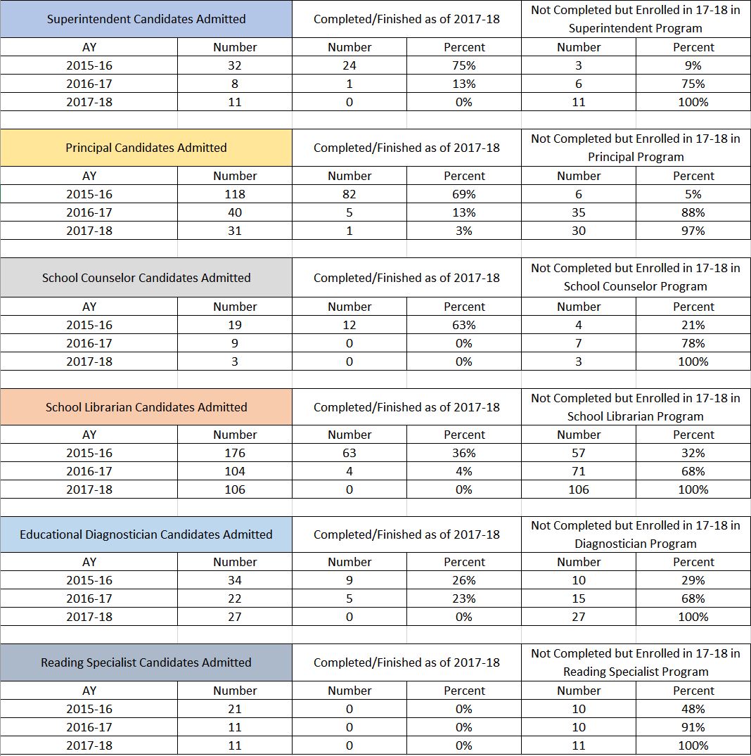 The data below compares those admitted to SBEC certification programs at SHSU in years past versus how many completed the programs by 2017-18. Five years of Teacher Candidate data is shown; three years of Advanced Program Candidate data is shown.