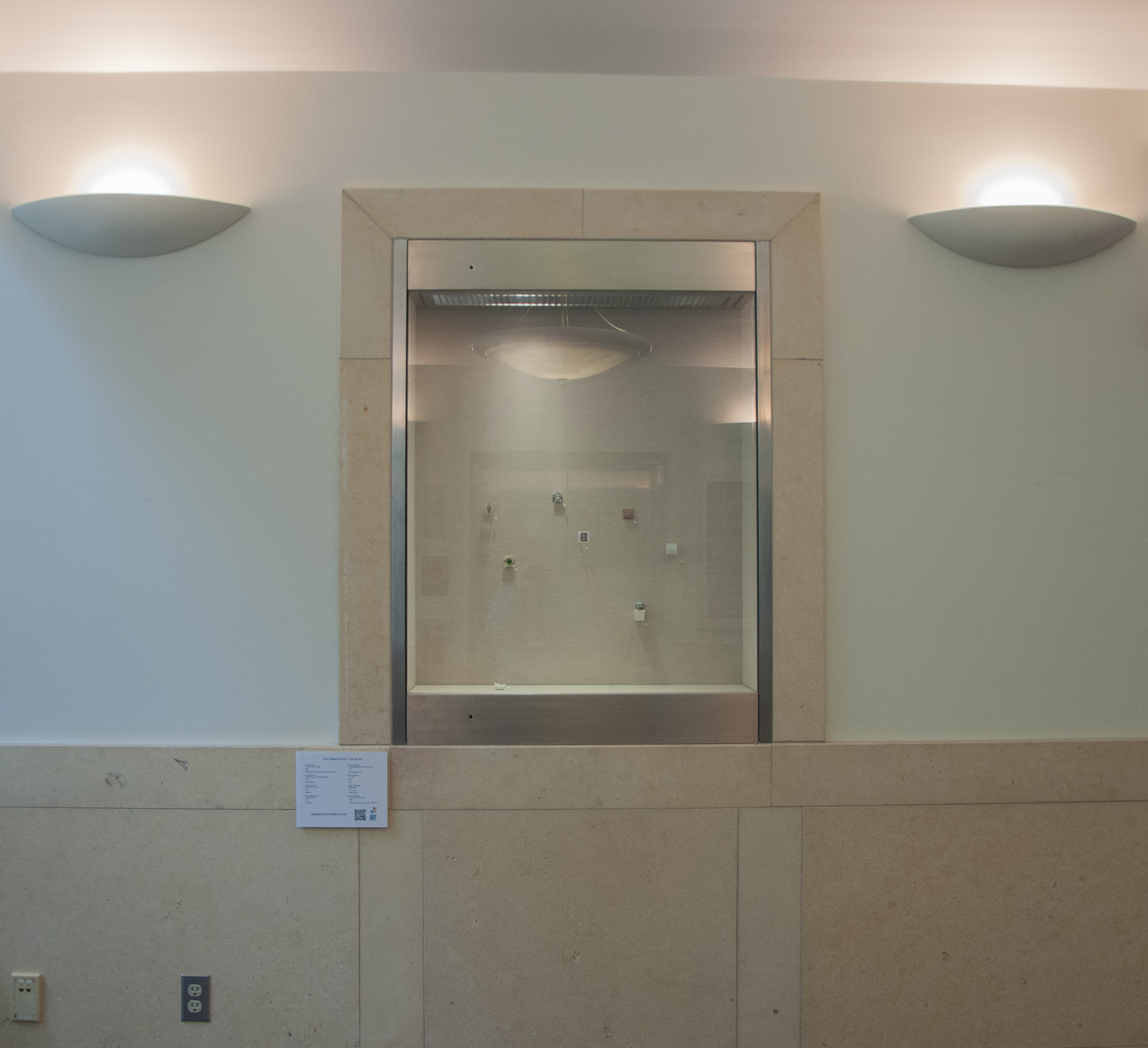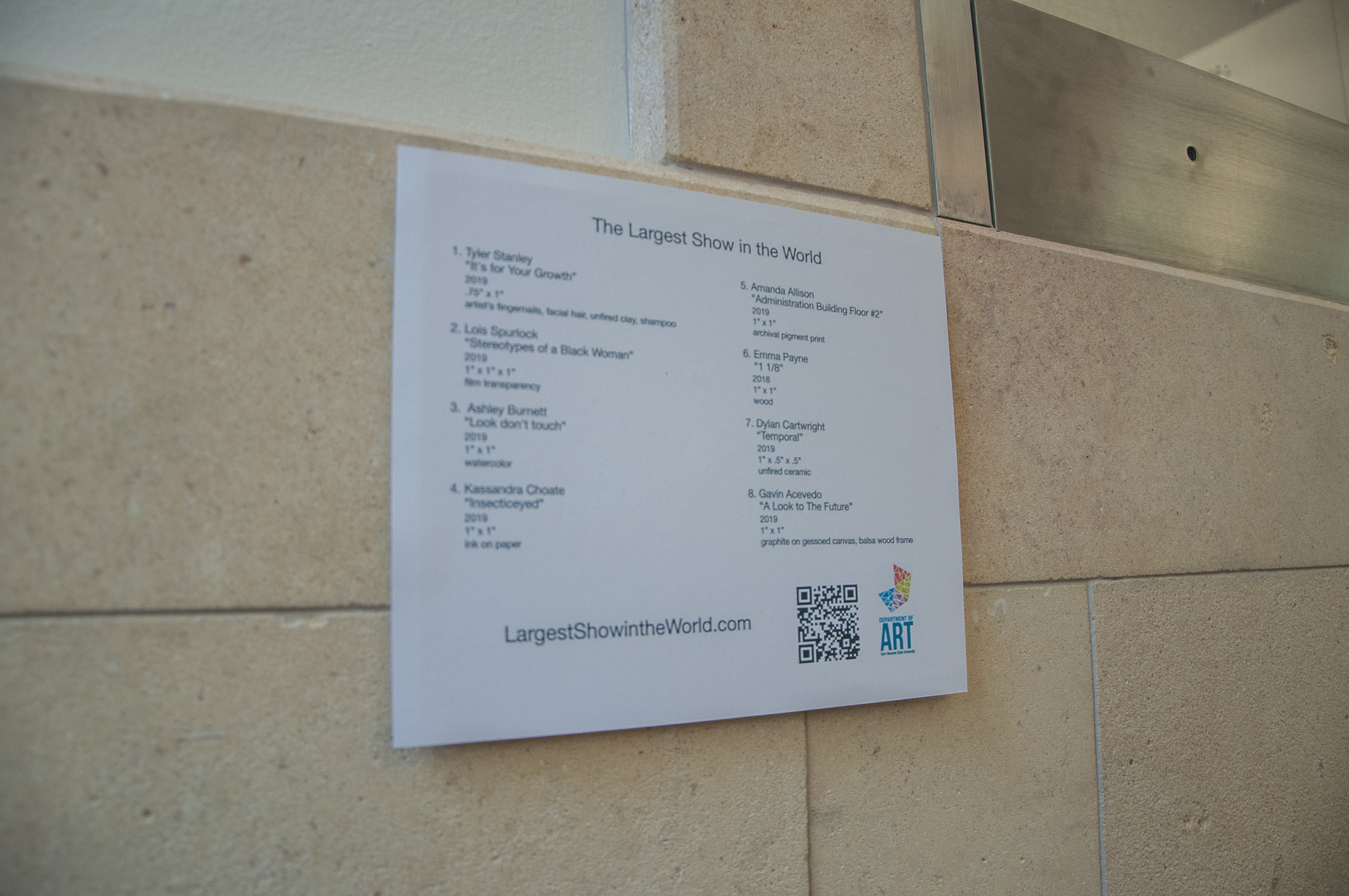 In an unusual place, at an unusual size sits the intriguing exhibition referred to as “The Largest Show in the World”, a show of epic proportions, presented by the Advanced Studio class of the Department of Art.