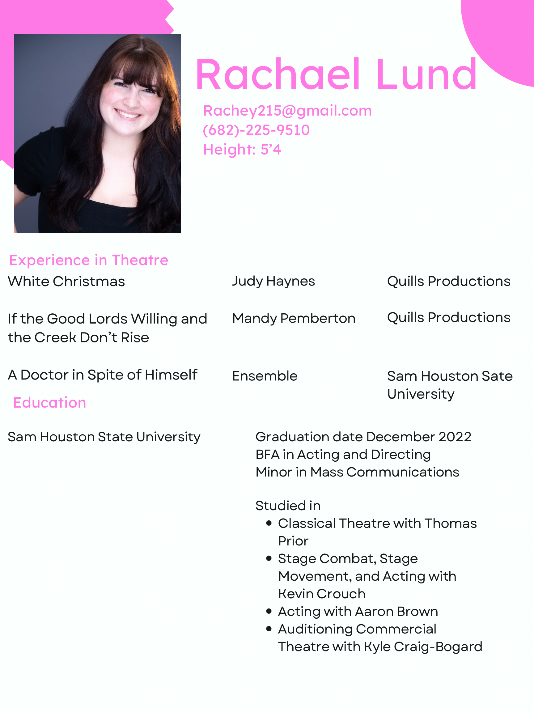 Rachael Lund was raised in Springtown, Texas where only her dreams were big! She found her passion for performance in 2014 and since then her professional credit includes: A Doctor In Spite of Himself (ensemble). In addition to performing, Rachael also loves to film ASMR videos, Paint, and spend time with her cat, Broccoli! After Graduation (December 2022) Rachael plans to pursue a career in performance wherever it takes her. You can find Rachael on her Instagram @Rachaelannalund